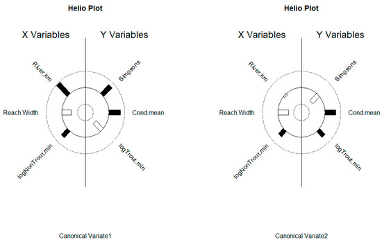 Canonical correlations (CanCorr) [37] was used to explore multivariate relationships among stream variables and catch statistics. CanCorr finds separate linear combinations for the stream and catch multivariate data sets that have the maximum correlation with each other; these are denoted as the first canonical variate pair. Subsequent pairs of canonical variates (i.e., second, third, and so on) are independent of all previous canonical variates and show relationships among variables after accounting for factors driving all previous canonical variates. However, correlation strength decreases for subsequent canonical variates, so approximate F-tests [37] were used to test for non-zero correlations between canonical variate pairs. Heliographs [38] of the correlations between all significant canonical variates and the stream variables and catch statistics were used to portray multivariate relationships among stream characteristics.