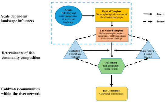 A flow-chain model of the distribution of coldwater refugia (Figure 6) shows their spatial array across the Whitewater River network to be the product of multiple biophysical interactions. The flow regime and water temperature are the main drivers that act upon the geomorphological structure of the riverine landscape. The output of this interaction, the altered physical template, directly influences the potential assemblage of coldwater refugia within the river network—the type, abundance, and position in the network [47]. Controllers, such as fish population density, competition, and social influences like fishing intensity, influence community structure of coldwater fishes within the network. Controllers interact via a series of interactions between the provision of coldwater refugia and coldwater fish community composition. Overall, this framework helps to understand the complex relationships between drivers, the physical template, and responses (ecological) and ecosystem services (social) within coupled riverine landscapes.