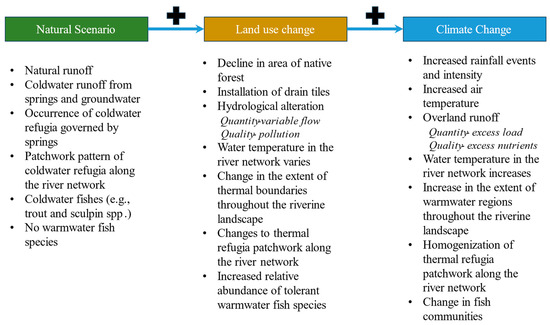 Thermal regimes are controlled by exchanges with air temperature and groundwater [27]. Understanding the complexity of these relationships and how communities are influenced (i.e., distribution and composition) by such interactions is important for predicting how lotic systems are responding to change. Climate change and land use habits are known to be drivers of both thermal regimes [27] and the biological assemblages associated with temperature pattern-driven streams influenced by groundwater [40]. Under the current conditions, we may see changes in biological communities. Consider a flow-chain model (Figure 7) to attempt to predict how river ecosystems may respond. In a scenario with minimal stressors (i.e., no climate change, natural landscape), a natural setting exists. Under a natural setting, a typical set of conditions for a particular stream in a karst region in southeastern Minnesota are characterized. These will be influenced by changing conditions (disturbances) via land use. The result may be a new set of conditions as a response to land use. Now, couple land use with climate, creating yet again a different set of conditions. Each change has implications for the current physical structure (habitat) and its proper functioning (communities).