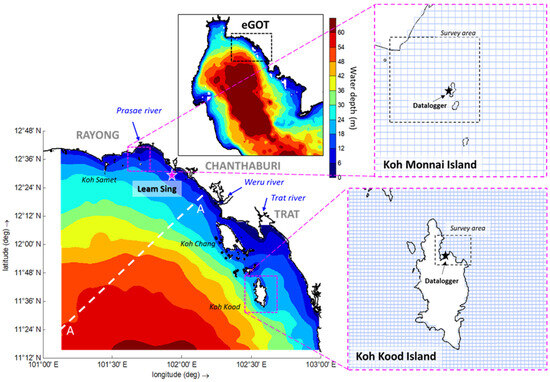 Location map, bathymetry, and modeling domain of the eastern Gulf of Thailand (eGOT) within the larger Gulf of Thailand. Star symbols indicate the locations of field-observed data, while inset plots provide detailed views of the modeling grid and survey areas near Koh Monnai Island and Koh Kood Island. Dashed white line shows location the A-A section.