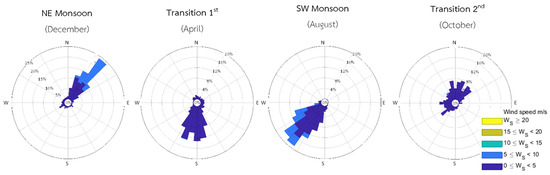 Wind data from the ECMWF-ERA5 reanalysis dataset [20] exhibit good agreement with measurements from Thailand’s Meteorological Agency stations. Averaged over 15 years, the ECMWF-ERA5 data, as depicted in Figure 2, illustrates the significant influence of the Asian–Australian monsoon system, characterized by two monsoon seasons and two transitional periods. Specifically, the northeast monsoon (NEM) occurs from November to February, the first monsoon transition (Transition 1) from March to April, the southwest monsoon (SWM) from May to September, and the second monsoon transition (Transition 2) in October. To represent these distinct climatic conditions, December, April, August, and October were selected to, respectively, signify the NEM, Transition 1, the SWM, and Transition 2. Wind during monsoons are slightly stronger winds when compared to the relatively calm wind during the monsoon transitions.