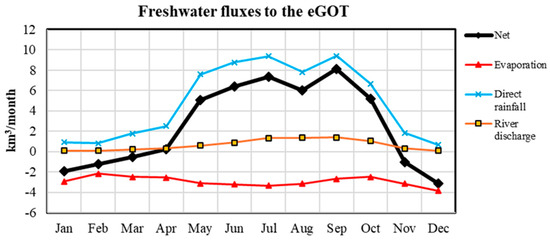 Freshwater fluxes of the eGOT. Data are from the ECMWF-ERA5 reanalysis dataset and the GloFAS dataset averaged monthly between 2006 and 2020.