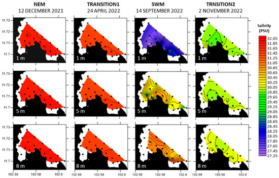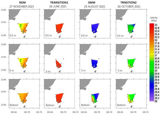The salinity distribution at various times and depths around Koh Kood Island was derived from synoptic survey data interpolation. The locations of the measurements are denoted by black dots.