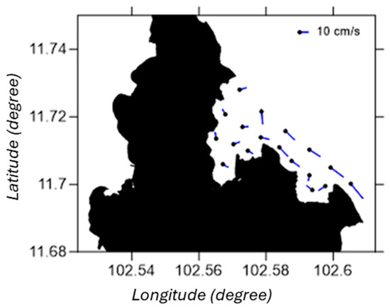 Seasonal synoptic measurements were conducted around Koh Monnai Island and Koh Kood Island to collect water temperature and salinity data using a multi-parameter water quality profiling sonde (AAQ-RINKO, JFE Advantech, Kobe, Japan). Additionally, current flow velocity profiles were obtained using an acoustic Doppler current profiler (ADCP) with bottom tracking functionality (Sentinel Workhorse 1200 kHz, Teledyne RD Instrument, San Diego, CA, USA), measuring downward-facing currents. Salinity distribution at various depths around Koh Monnai Island and Koh Kood Island is presented in Figure 4 and Figure 5, respectively. ADCP measurement results at Koh Kood Island are depicted in Figure 6, with the survey area location map provided in Figure 1. The observational sites were sourced from two different study projects. Since both are located in the eGOT, we combined them to represent field data for our study area.