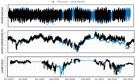 Comparison between continuous measurements of the water level, water temperature, and salinity at Koh Monnai Island and the modeled results. The measurement data are represented by blank dots, while the model results are indicated by a blue line.