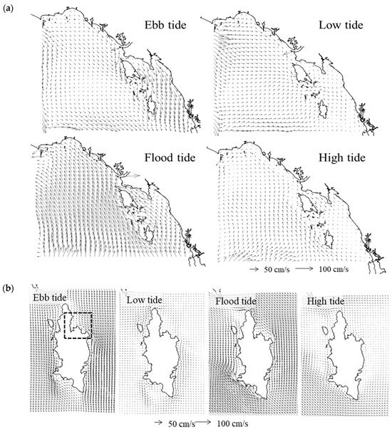 Tidal currents play a pivotal role in mobilizing and mixing the entire water column within coastal seas. In the eGOT, tides drive water movement alternately along the coastline in a northwest to southeast axis. During the flood tide, tidal currents flow northwestward, while they shift southeastward during the ebb tide. Tidal currents ease during high and low tides. Maximum tidal current speeds during spring tides range between 0.3 and 0.5 m/s, halving during neap tides. Offshore tidal current speeds generally exceed those near the shoreline, except in channels between land and island and island and island (see Figure 8a). Local shoreline irregularities and bathymetry intricately influence tidal flow patterns. At the lee side of headlands, currents change direction, forming clockwise and counterclockwise eddies, evident in both field measurements (see Figure 5) and well reproduced by modeling (see Figure 8b).