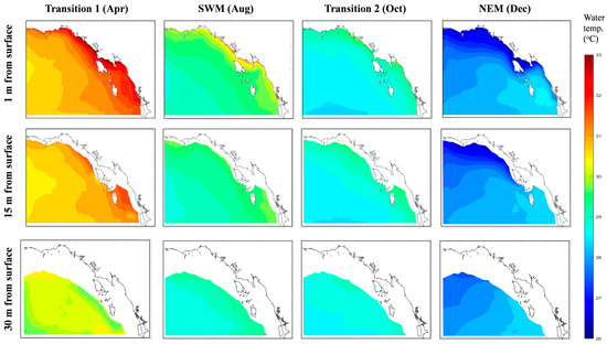 Modeled monthly averaged water temperature at 1 m, 10 m and 20 m from the sea surface at different monsoonal periods.