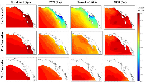 Modeled monthly averaged salinity at 1 m, 10 m and 20 m from the sea surface at different monsoonal periods.