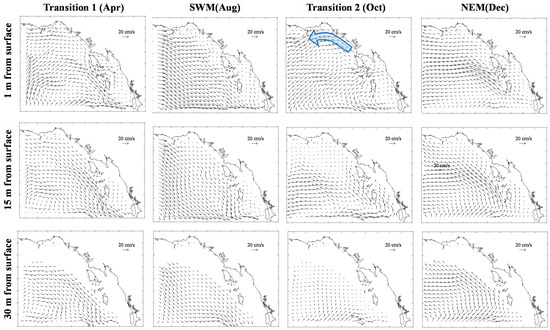 Modeled monthly averaged flow velocity field at 1 m, 15 m and 30 m from the sea surface at different monsoonal periods. Light blue translucent arrows present near-surface values during Transition 2 in the Chanthaburi Coastal Current.