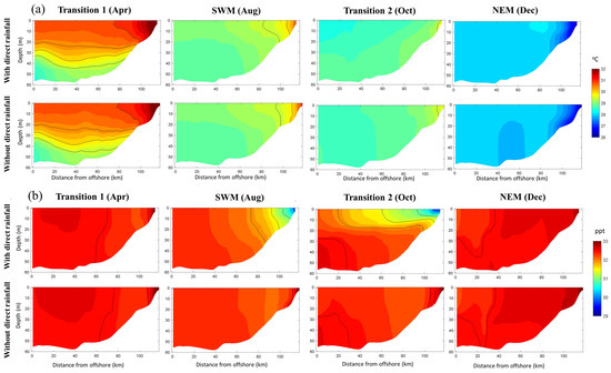 Distribution of the (a) water temperature and (b) salinity along the A-A section at different monsoonal periods from the model run with and without the direct rainfall into the sea.