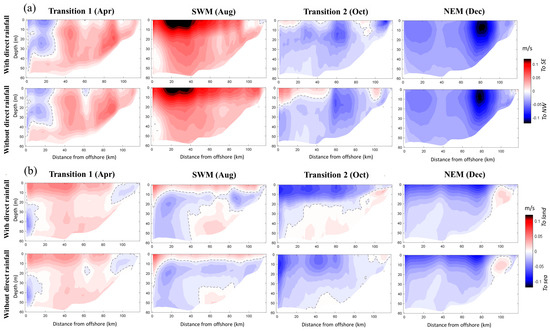 Distribution of the (a) monthly averaged flow velocity across the A-A section and (b) along the A-A section at different monsoonal periods from the model run with and without the direct rainfall into the sea.