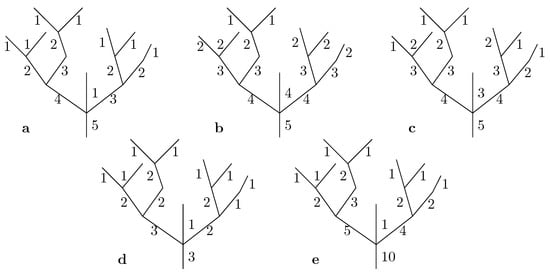 Illustration of and comparison between different stream-ordering methods. (a) Lower limits of the feasible stream-order values from our proposed methods. (b) The upper limits of the feasible stream-order values from our proposed methods. (c) Another feasible set of stream-order values conforming to the two rules of our proposed ordering methods, as described in Table 1. (d) The Strahler stream-ordering method. (e) The Shreve stream-ordering method.