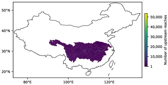 Yangtze River basin network delineated from the MERIT-Hydro dataset. The black lines outline the national boundaries or coastal lines of China, providing a geographical context. The color-coded lines depict the river reaches. Each color indicates the total number of reaches, encompassing the current reach and all upstream reaches.