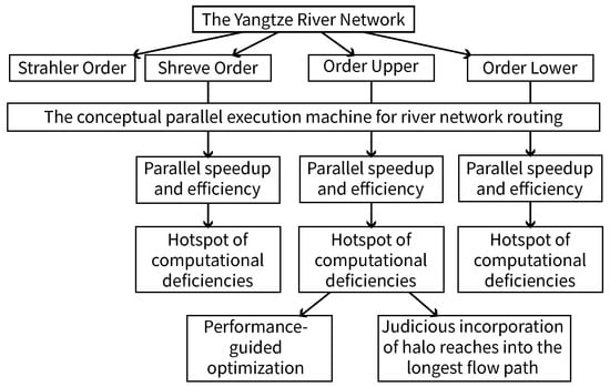 Figure 3 shows the workflow of this study. Initially, in Section 4.1, we assign the Strahler, Shreve, and the upper and lower bounds of our proposed stream orders to the Yangtze River network, adhering to the rules detailed in Table 1 and depicted in Figure 1. Subsequently, in Section 4.2, we assess the computational performance of the Shreve order and the proposed stream orders’ upper and lower bounds using the conceptual shared-memory parallel execution machine described in Section 2.3. We measure this performance in terms of parallel speedup and efficiency and evaluate its scalability with an increasing number of processors. We also pinpoint hotspots of computational deficiencies. Lastly, in Section 4.3 and Section 4.4, we demonstrate that our proposed stream-ordering method can be optimized, guided by the measured computation deficiencies, and can incorporate halo reaches into the longest flow path. This incorporation can significantly enhance computational performance and parallel scalability.
