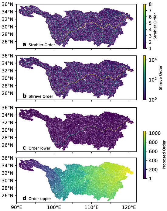 Spatial distribution of stream orders over the Yangtze River basin. (a) The Strahler order. (b) The Shreve order. (c) The lower bounds of the proposed order family. (d) The upper bounds of the proposed order family.
