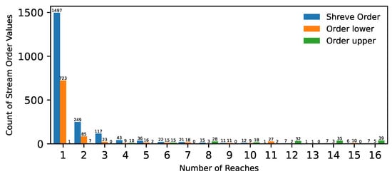 The count of stream-order values with a limited number of reaches. For the sake of clarity, only stream orders with 16 or fewer reaches are illustrated.