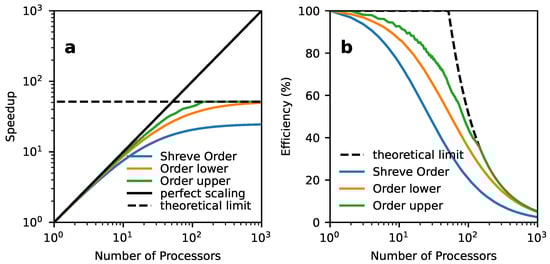 Parallelization speedup (a) and efficiency (b) for the Shreve orders and the proposed stream orders, respectively. The solid black lines represent the ideal speedup or efficiency under conditions of perfect scaling. The dashed black lines indicate the limits imposed by the upstream-to-downstream sequentiality along the longest flow path.