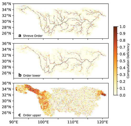 Figure 4 illustrates the spatial distribution of the proposed stream orders in the Yangtze River basin, juxtaposed with those of the Strahler and Shreve stream orders. The Strahler system exhibits a narrow range of order values, with a maximum value of eight observed in this case. This limited range restricts its application to parallelizing branches, akin to the mizuRoute model [], rather than individual reaches. The coarse granularity of the Strahler order poses challenges for achieving effective load balancing.