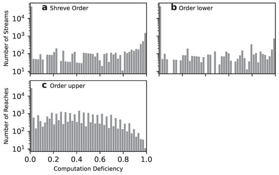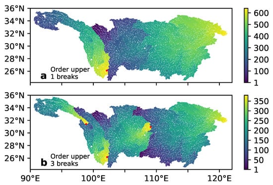 Figure 4c,d display the spatial distribution of the lower and upper bounds of our proposed order family, respectively. These bounds range from 1 to 1042, which corresponds to the number of reaches along the longest flow path. The upper bound demonstrates an even distribution of order values throughout the river network, while the lower bound shows a greater concentration in the lower order values. For the upper bound, a limited number of order values are assigned to a small set of reaches, as shown in Figure 5. The balanced distribution of order values, along with the adequate granularity and the presence of sufficient reaches sharing the same order value, render the upper bounds of our proposed stream-order family particularly well suited for parallel river network routing.