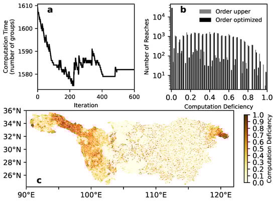 Figure 9a illustrates the reduction in total computation time at each optimization iteration. The total computation time experiences a rapid decline during the initial iterations, followed by a gradual stabilization. The stream orders that yield the minimum total computation time are then selected for further analysis. A comparison of the histograms of computation deficiencies between the optimized orders and the upper bounds of the stream-order family is presented in Figure 9b. The optimization results in a slight reduction in the number of reaches with high computation deficiencies. Figure 9c displays the spatial distribution of computation deficiencies, showing that the optimization strategy effectively reduces these deficiencies, particularly in the middle reaches. However, the headwater and downstream regions exhibit negligible changes, indicating that a more advanced optimization strategy may be necessary to achieve enhanced parallel performance uniformly across the river network.