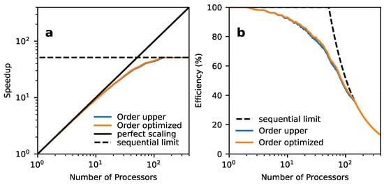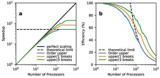 Same as Figure 6 but for the upper bounds of the order family with two (the orange lines) or four (the blue lines) breaks along the longest flow path. (a) Parallelization speedup. (b) Parallelization efficiency.