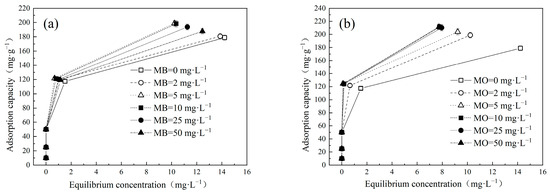 The impact of varying initial pollutant concentrations on adsorption of Cu(Ⅱ) and dyes onto LDH@GO-SH was systematically evaluated using a series of test solutions containing different concentrations of Cu(Ⅱ) (ranging from 0 to 50 mg·L−1) and dyes (ranging from 0 to 50 mg·L−1) in single and binary systems (Figure 1 and Figure 2). Notably, the adsorption capacities of Cu(II) onto LDH@GO-SH exhibited an enhancement in the presence of dyes. At the initial Cu(Ⅱ) concentration of 50 mg·L−1, the adsorption capacities for Cu(Ⅱ) in single, MB–Cu binary, and MO–Cu binary systems (at the initial dye concentration of 50 mg·L−1) were 178.87 mg·g−1, 187.75 mg·g−1, and 211.33 mg·g−1, respectively. Results showed that both MB and MO facilitated the adsorption of Cu(Ⅱ); the effect of MO was more prominent.