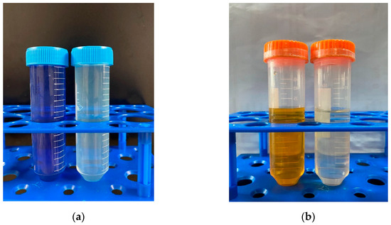 The color changes of (a) an MB–Cu(Ⅱ) mixed solution and (b) an MO–Cu(Ⅱ) mixed solution before and after adsorption.