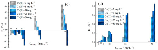 (a) The Er-Cu values for adsorption amounts in the MB–Cu(II) binary system; (b) the Er-Cu values for adsorption amounts in the MO-Cu(II) binary system; (c) the Er-MB values for adsorption amounts in the MB-Cu(II) binary system; and (d) the Er-MO values for adsorption amounts in the MO-Cu(II) binary system.