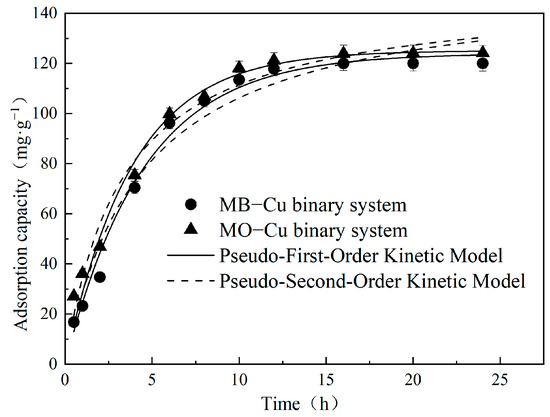 The influence of contact time on Cu(II) adsorption in both MB–Cu and MO–Cu binary systems was studied under conditions where the initial concentration of pollutant (Cu(II), MB, or MO) was 25 mg·L−1; the temperature was 25 °C; and pH = 5. The results are depicted in Figure 5. The adsorption capacities of Cu(II) increased sharply during the first 5 h, and finally achieved equilibrium at approximately 12 h in both MB–Cu and MO–Cu binary systems. Adsorption kinetic data were analyzed using a pseudo-first-order kinetic model and pseudo-second-order kinetic model, and the resulting kinetic parameters are summarized in Table 2. The adsorption kinetics of Cu(II) in both MB–Cu and MO–Cu binary systems could be well-described by the pseudo-first-order kinetic model, and were confirmed by the high determination coefficients (R2 > 0.98), and the experimental equilibrium adsorption capacities (qe,exp) of Cu(II) were similar to the calculated equilibrium adsorption capacities (qe,cal). The existence of different dyes (MB and MO) did not significantly affect the adsorption capacities of Cu(II) by LDH@GO-SH, which was evidenced by the similar adsorption kinetics curves observed from MB–Cu and MO–Cu binary systems. Kinetic results also showed a similar qe,cal of 123.98 for the MB–Cu system and 125.12 mg·g−1 for the MO–Cu binary system.