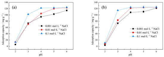 Figure 6 exhibits the effect of pH and ionic strength on the adsorption performance of Cu(II) onto LDH@GO-SH in binary systems. It is notable that an increase in solution pH significantly facilitated Cu(II) adsorption; the adsorption capacities increased sharply when the solution pH increased from two to four, and followed a slight increase with further increasing of the pH to six. Similar findings were obtained in Cu(II) adsorption on banana stalk biochar [30] and functionalized straw [18]. The pH of a solution is a crucial factor influencing adsorption performance. Theoretically, pH can affect the surface charge of the adsorbent and the existing forms of pollutants in the solution [31]. At high pH levels, the thiol groups on LDH@GO-SH tended to deprotonate, and the surface of LDH@GO-SH was negatively charged. The negatively charged surface of LDH@GO-SH was beneficial for improving the adsorption capacities of Cu(II) due to the electrostatic attractive force. Consequently, the effect of pH on Cu(II) adsorption by LDH@GO-SH can be attributed to the electrostatic interaction mechanism between the negatively charged LDH@GO-SH surface and positively charged Cu(II).