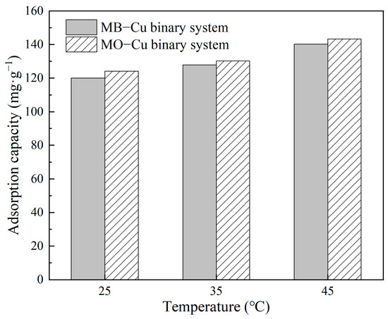The effect of temperature on Cu(II) adsorption in both MB–Cu and MO–Cu binary systems is illustrated in Figure 7. The results showed that temperature slightly improved the adsorption of Cu(II) in binary systems. When the temperature increased from 25 °C to 45 °C, the adsorption capacities of Cu(II) increased from 120.04 mg·g−1 to 140.21 mg·g−1 for the MB–Cu binary system, and increased from 124.17 mg·g−1 to 143.27 mg·g−1 for the MO–Cu binary system. This concluded that a higher temperature is favorable to the adsorption processes of Cu(II) on LDH@GO-SH.