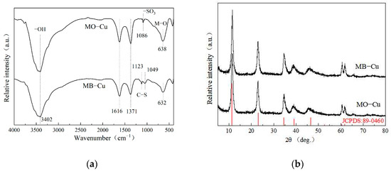 The FTIR spectra of LDH@GO-SH after adsorption are shown in Figure 8a. Compared with the FTIR before adsorption, the intensity of adsorption peaks at ~3450 cm−1 and ~1630 cm−1 decreased obviously, indicating that functional groups like hydroxyl groups are involved in the adsorption process [33,34]. Peaks occurred at 1123 cm−1 and 1049 cm−1 and are indicative of the stretching vibration of the C–S bond of MB, which directly confirmed the plentiful loading of MB on LDH@GO-SH. Evidence of the presence of -SO3 groups of MO at 1086 cm−1 is presented in Figure 8a. These results revealed that LDH@GO-SH had significant adsorption abilities for MB and MO. Moreover, the adsorbed MB or MO provided new groups on LDH@GO-SH, which might provide additional adsorption sites for Cu(II). The XRD spectra of LDH@GO-SH after adsorption in binary systems are shown in Figure 8b. After adsorption, LDH@GO-SH maintained its original crystal structure and no new diffraction peak appeared, indicating the material structure did not change during the adsorption process.