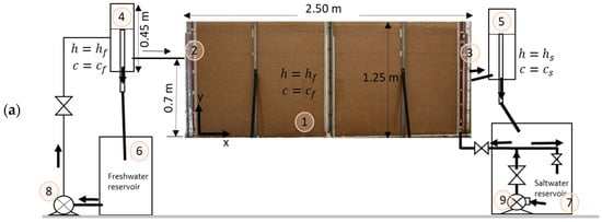 The experimental setup consisted of a rectangular flow tank 1.25 m in height that was divided into three compartments, two side chambers (fresh and saltwater), and two side reservoirs of water (fresh and saltwater). Figure 1 presents a schematic diagram of the experimental setup. It shows (1) the main compartment with a 2.50 m length where the porous media is stored, (2) the left-side compartment of 0.1 m filled with freshwater; and (3) the right-side compartment of 0.1 m filled with saltwater. The side compartments were separated from the central compartment by a fine mesh screen with holes of 0.074 mm in size, also called mesh No. 200, to prevent sand from escaping the central compartment.