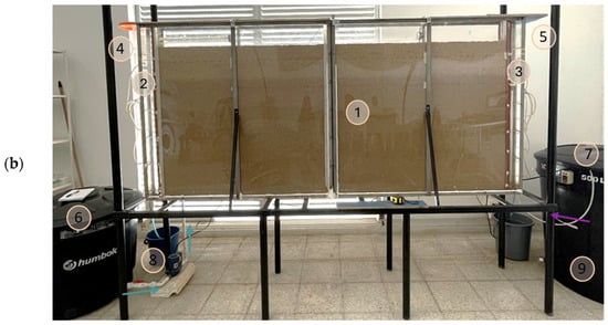Prior to the construction of the experimental setup, a thorough literature review was conducted to identify the adequate dimensions, considering the type and quantity of experiments, and the available space at the facilities []. This review narrowed the ratio of the length vs. height to be used in the setup. The experimental setup is part of a larger project that can simulate land subsidence and various driving forces in the same system. Therefore, large horizontal and vertical dimensions are required to visualize the saline wedge and its interaction with other variables. Additionally, a scale comparison simulation was previously performed to verify that the selected dimensions for the experimental setup did not alter the dynamic of the saline wedge.