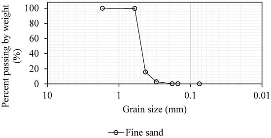 The packing of the sand was performed following Weber’s methodology []. It consists in filling the main compartment with 10 cm of water, followed by 10 cm of sand using a PVC tube connected to a funnel located just above the water’s surface when filling. After the first layer of sand is filled, 10 cm more of water is added, and later the next layer of 10 cm of sand is added as well. This method prevents air entrapment, and the previous sieve of sand reduces variations in the grain size.