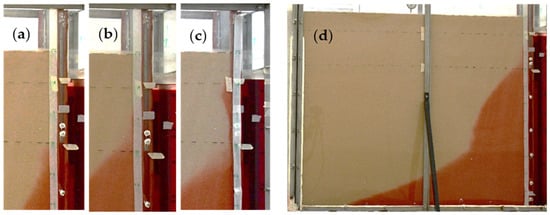 Seawater boundary in the head-controlled case: (a) after 1 h; (b) after 3 h; (c) after 5 h; (d) right half of the experimental setup after 3 h.
