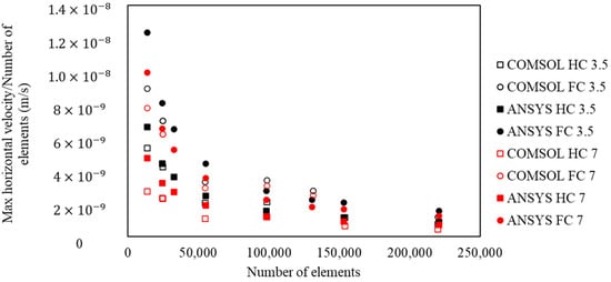 Mesh convergence estimating the maximum horizontal velocity after three and a half hours (black symbols) and seven hours (red symbols) with ANSYS Fluent under head-controlled and flux-controlled conditions and COMSOL Multiphysics under head-controlled and flux-controlled conditions.