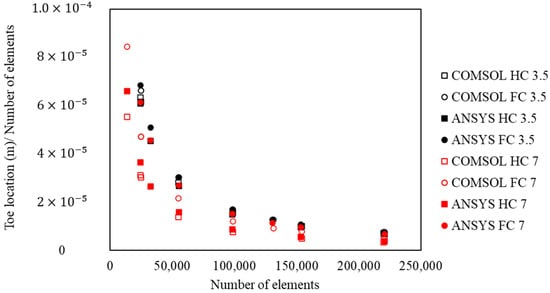 Mesh convergence estimating the toe location after three and a half hours (black symbols) and seven hours (red symbols) with ANSYS Fluent under head-controlled and flux-controlled conditions and COMSOL Multiphysics under head-controlled and flux-controlled conditions.