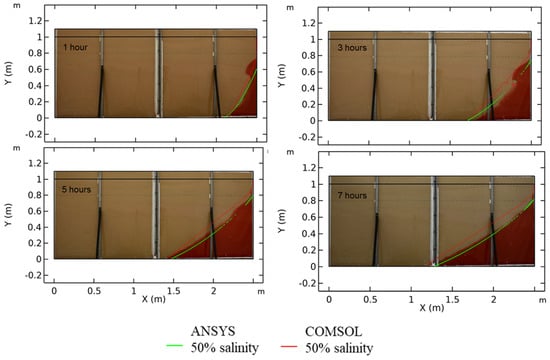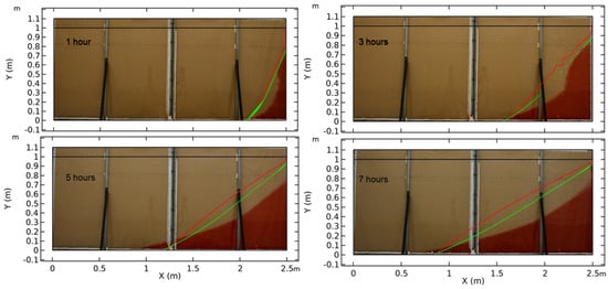 This control and reduction in the freshwater outflow lowers the hydraulic gradient toward the saltwater side, and allows further intrusion of the saline wedge []. On the saltwater compartment, the 1 cm lens could potentially lower the seawater density, water pressure, and the initial geometry of the saline wedge [,]. Figure 3 depicts the saline wedge movement during the first three hours, while the 1 cm lens was still visible in the saltwater compartment.