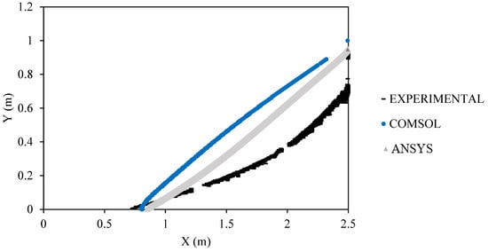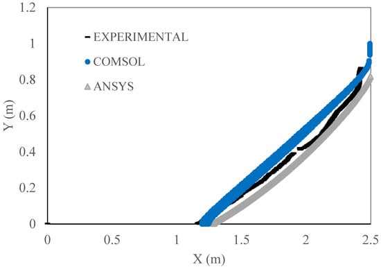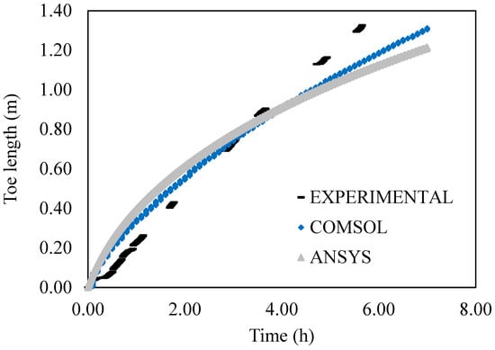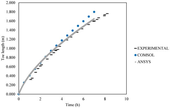 For the mesh sensitivity, the maximum horizontal velocity and the concentration profile were analyzed. To eliminate variations induced by the mesh, identical meshes were used in COMSOL and ANSYS Fluent. The Courant number was considered as a target to select the time step and the element size of the selected mesh. Every simulation had the same parameters, except for the mesh size and boundary conditions. The results of the two boundary conditions, the head-controlled condition and the flux-controlled condition, were compared. Seven different meshes were considered for COMSOL and ANSYS. The finest mesh had a total of 220,000 elements and an element size of 0.005 m; the coarser mesh had a total of 13,930 elements and an element size of 0.01 m. For the head-controlled condition, the mesh that allowed for the independence of the results was the one with 154,000 elements and an element size of 0.006 m; when the mesh was imported into COMSOL and to ANSYS Fluent, the amount of data changed to adjust the software applications’ discretization, resulting in a total of 154,030 elements for COMSOL and 153,222 elements for ANSYS Fluent. The toe location and the average and horizontal velocities were analyzed with the changes of meshes, reaching a close agreement between COMSOL and ANSYS with a mesh of approximately 154,000 elements. The mesh sensitivity results from the horizontal velocity and estimated toe location are presented in Figure 4 and Figure 5, respectively.