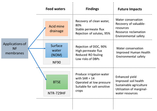 The objective of this study was to assess the use of two types of NF membranes (NF90 and NTR-729HF) in treating three different types of wastewater—acid mine drainage (AMD) solution, surface water containing NOM, and MF-BTSE—to produce water for irrigation purposes. The governing mechanisms of the removal of inorganics and organics by the two NF membranes chosen are explained.