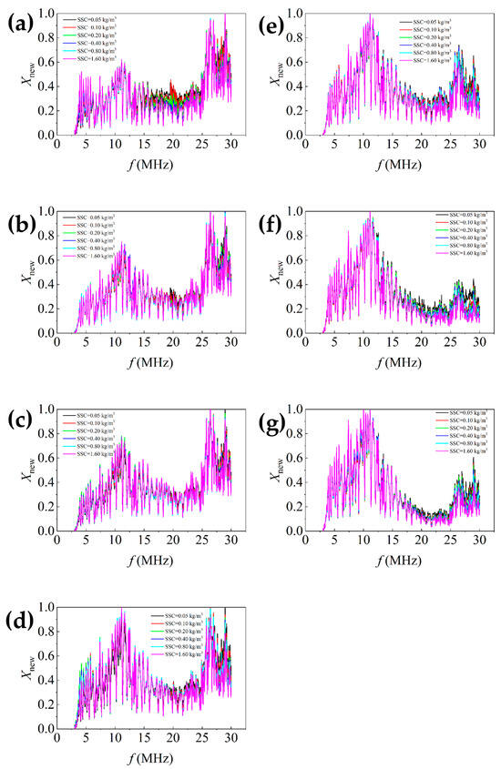 - The multi-frequency measurement experiments of a single particle size showed that the shape of the time-averaged normalised spectral map will not change with the change in concentration; only the corresponding Amp value will change at a certain proportion. The law of change in the Amp value is in line with the relevant studies of other scholars [12,15,37,48,49]; the smaller the particle size is, the higher the frequency corresponding to the peak is, and the larger the particle size is, the lower the frequency corresponding to the peak is.
