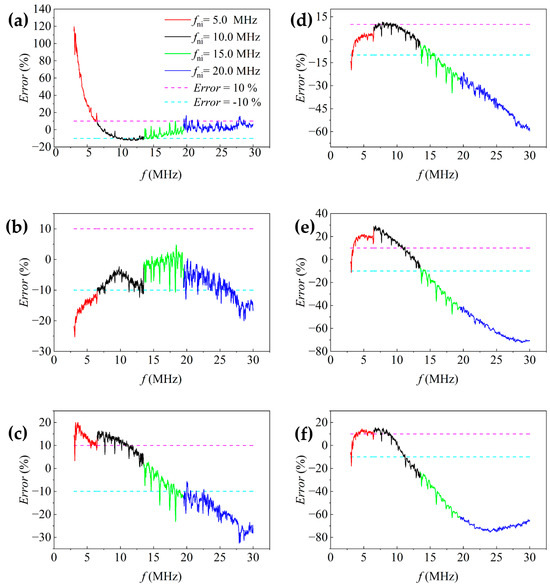 - Data analysis: The internal SOC of the measuring instrument performed FFT operation. The signals from four kinds of probes covering the studied bandwidth were converted from the time domain to the frequency domain in MATLAB2023a software with reference to Equation (5) [47]. This was performed for each group of experiments with 4500 frames measuring the signal data, which underwent splicing, integration, and noise abatement after the time-averaged normalisation analysis. Then, Equation (6) was used to calculate the particle size-Amp conversion error value for the analysis and evaluation.