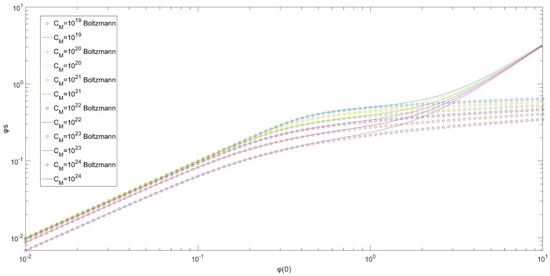 Figure 7, which is based on Equation (33) in combination with Equation (21), represents the dependence of on . To understand the figure, the terms of Equation (33) have to be analyzed. The first term defines Gouy–Chapman behavior, while the other two are derived from the Modified PB Model. When , as in our case of dilute solutions (), we have inverse camel-shape curves. The term camel-shape was introduced by Kornyshev [10,11] to describe the shape of the graph when . Of course, in our graphs, the curves are inverse because they represent . For small values of () and for low voltages, the system adheres to the Gouy–Chapman distribution, also known as the PB distribution. However, when the voltage exceeds , steric effects start to influence the system, causing the width of the diffuse layer to expand, which subsequently leads to a reduction in capacity. It is worth noting that these findings are entirely consistent with the results presented in [10,11,16].