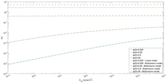 We observe the complete match of the two analyses for potentials , while the exact point where the deviation begins depends on the concentration . The maximum that the PB distribution holds is given by Equation (22) [7] ( for and for ), which is again in full agreement with our results.