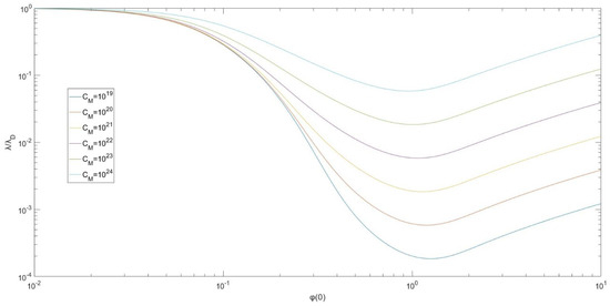 Figure 5 shows the relationship of versus for various concentrations, as determined by Equation (21), which takes into account steric effects (Modified Poisson Boltzmann PB model), in comparison with the results derived from the corresponding equation that utilizes the Poisson Boltzmann (PB) model, as elaborated in references [4,7]: