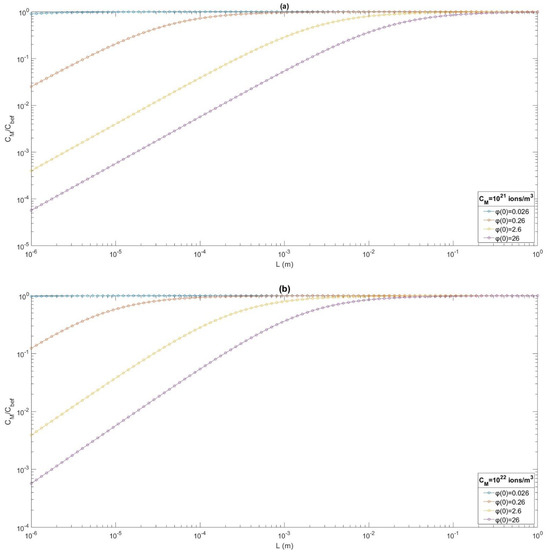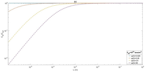 Figure 8 shows the ratio as a function of the duct width for various and for various potentials , , with Figure 8a–c utilizing a different target concentration . A general observation is that with increasing , the ratio increases, i.e., the ion removal efficiency decreases. The second observation is that as the duct width L increases, the ion removal efficiency decreases. Both results are logical, since it is expected that by increasing , we can achieve better purification ( decreases).