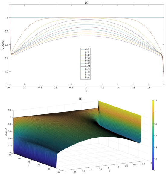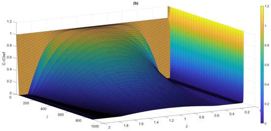 (a) The concentration for and as a function of the dimensionless width of the duct . When the dimensionless time , the value of , which is the value taken from Figure 8a for . (b) 3D plot of versus and .