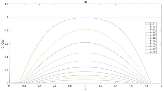 In the case of , the concentration is derived from Figure 8a, where . Given that in Figure 8a, the final state for , it follows that . Figure 9a depicts the concentration for , as a function of the dimensionless duct width for 10 different times. The value of that we are mainly interested in ( at the center of the duct where ) reaches the value 0.72 in dimensionless time , which corresponds to (for our calculations, we considered that we have salt ions with , and duct width ).