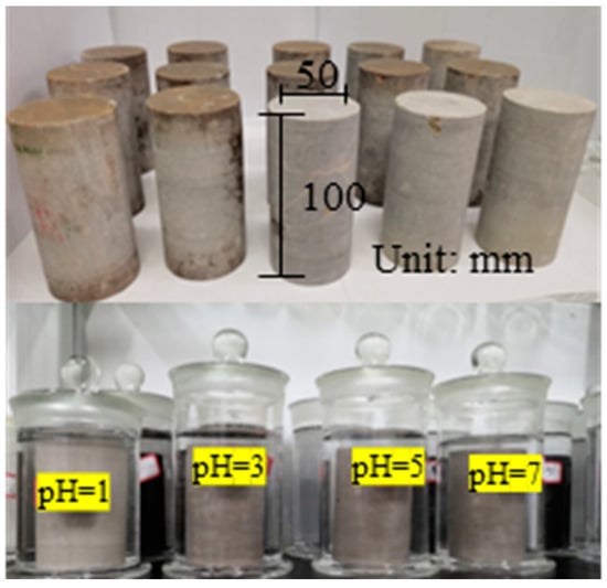 The waves velocity of rock samples was tested using a wave velocity tester. The wave velocity of each rock sample was close to each other, and the homogeneity of rock samples was good. Firstly, the dissolution test was carried out on the mechanical samples. The rock samples were placed in a closed glass container for dissolution. The pH was 1, 3, 5, and 7, respectively, and the solution was replaced every 3 days. After the dissolution test, the rock samples were placed in an electrothermal blast drying oven and dried at 105 °C for 12 h. The dried rock samples were placed in a microcomputer hydraulic servo pressure testing machine for conventional compression tests. Firstly, a uniaxial compression test was carried out. Because there was no confining pressure in the test, the test process was fast, and the uniaxial compression test can reflect the damage effect of dissolution on the internal structure of rock samples to a large extent.